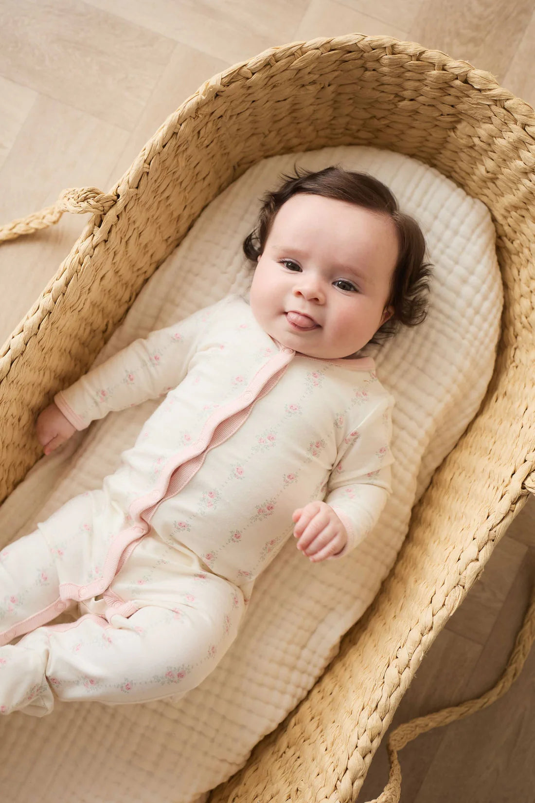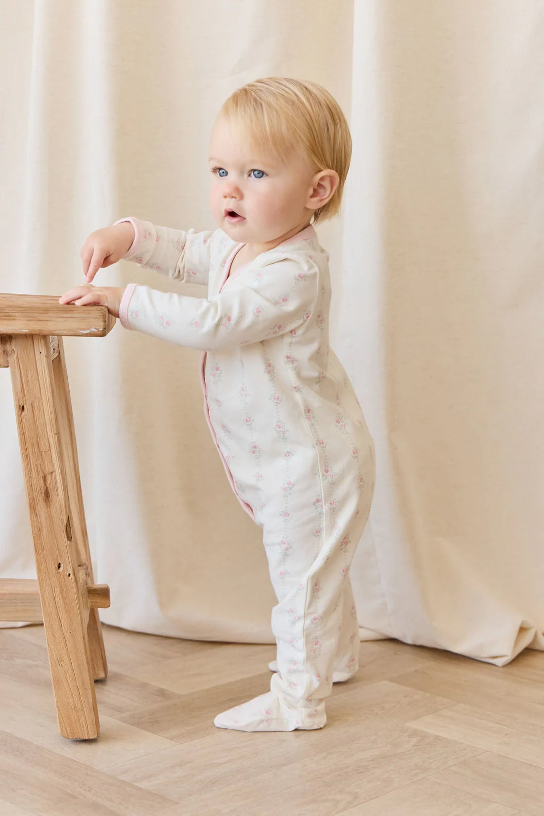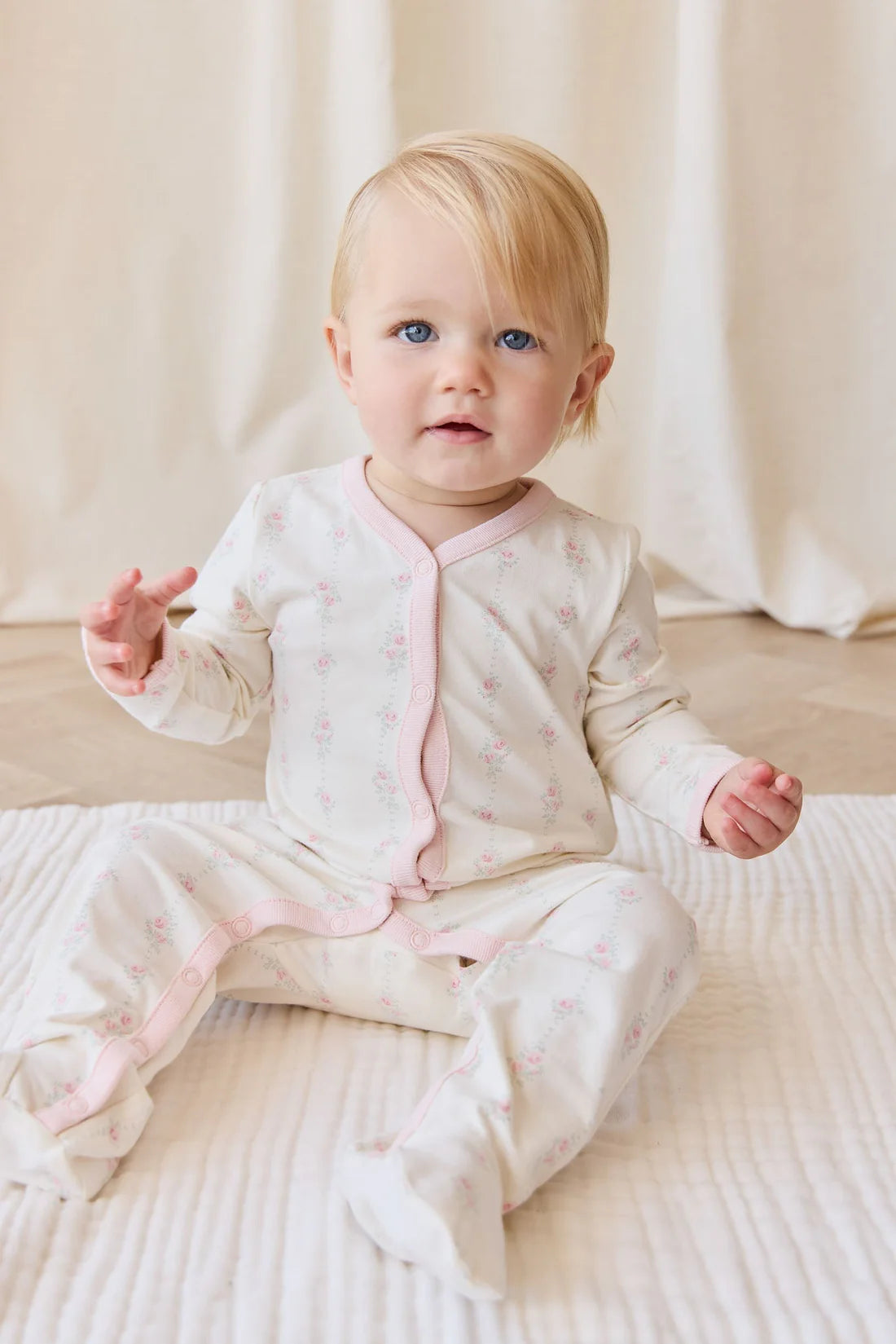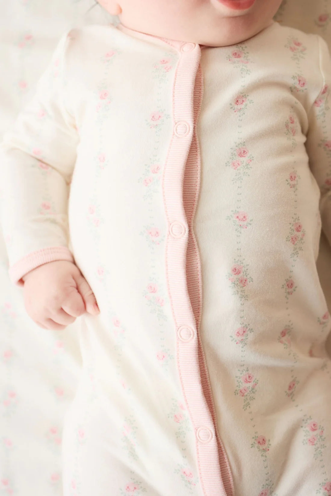 A sweet and practical essential for your little one, the Amory Onepiece in Rose Trail is crafted from a soft blend of 95% organic cotton and 5% spandex, offering gentle stretch and breathable comfort. This charming onepiece features a white base adorned with rose illustrations. Designed with long sleeves and legs, it includes snap domes down the front and along the legs for easy changing and all-day wear.