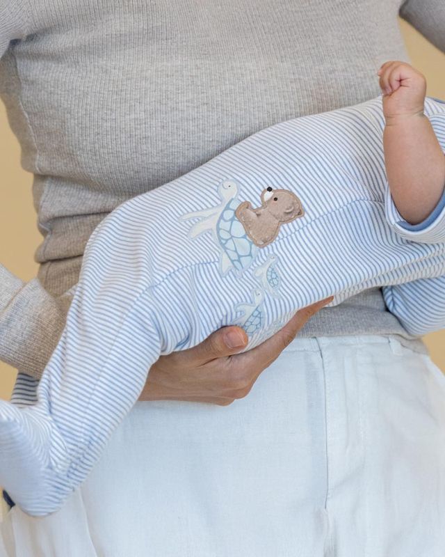 This beautifully soft Axel Stripe Zipsuit is crafted from 100% Organic Cotton and features a sweet boucle embroidered bear riding on the back of a turtle. Designed with practicality in mind, it has a full-length zip for easy dressing, a safety fold at the neck to protect delicate skin, and adorable appliquéd turtles that continue around to the back. Fold-over mittens help keep little hands warm and prevent scratching, while enclosed feet ensure your baby stays cosy from head to toe.