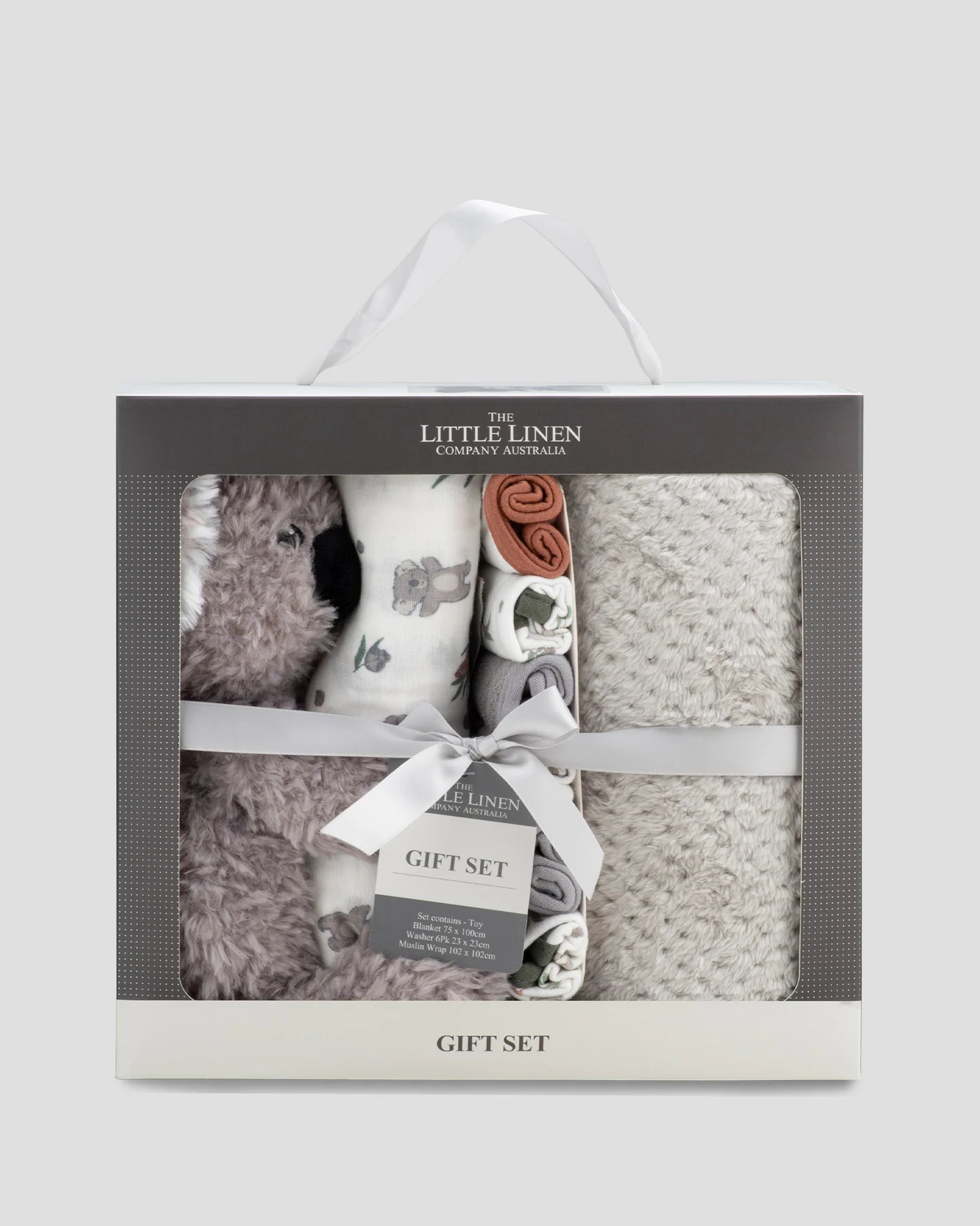 This Little Linen Company Boxed Gift Set - Outback Koala, combines key items to have on hand for any newborn bub.