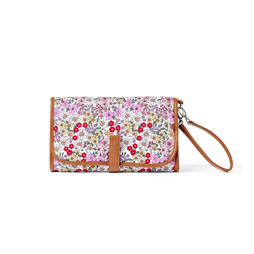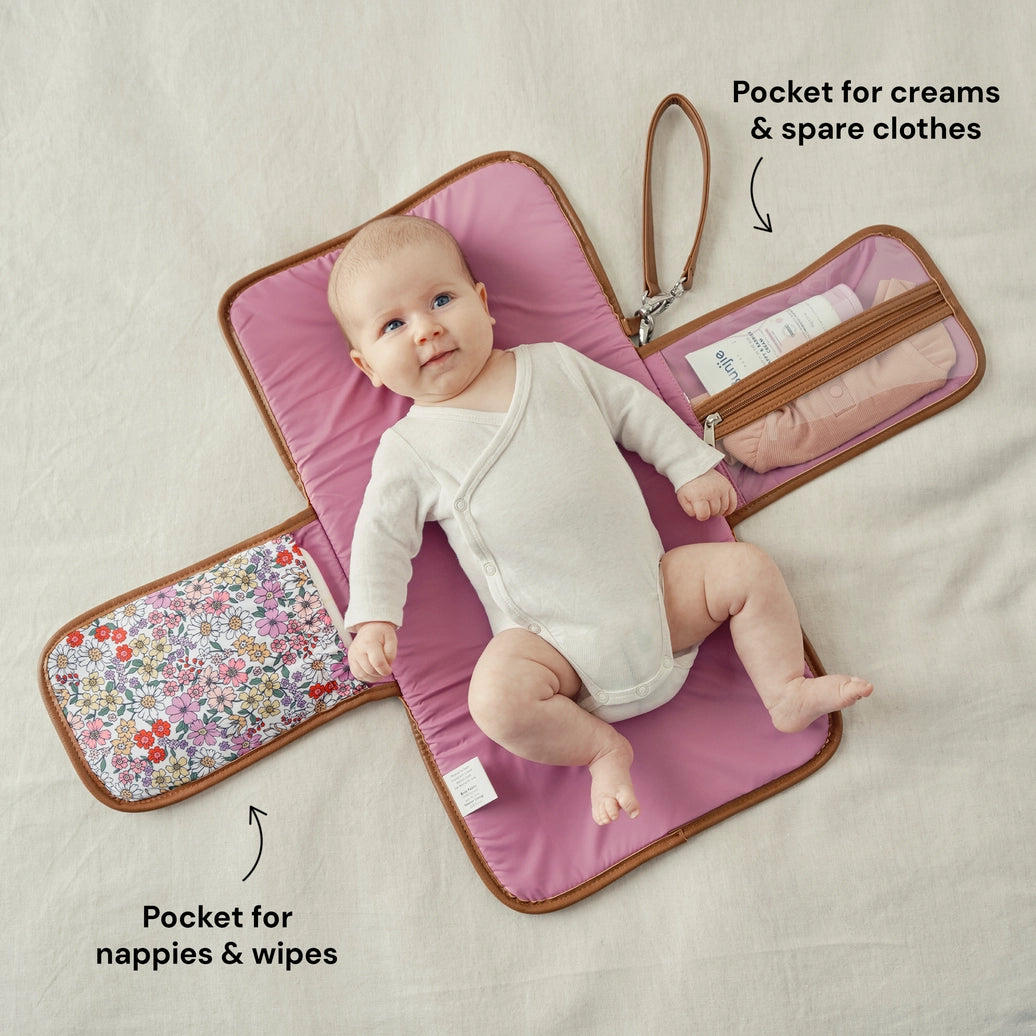 Our best-selling clutch folds out to reveal a padded mat to change baby's nappy on the go, a storage pocket for your nappies and a zip compartment for wipes & creams.