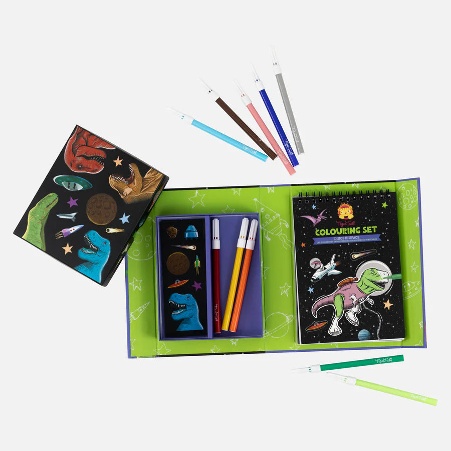 - Classic Tiger Tribe colouring set featuring fun dinosaurs in space illustrations
