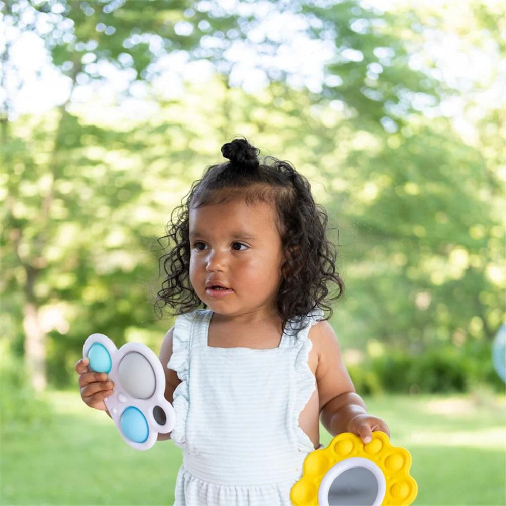 - Set of 2 sensory toys featuring silicone bubbles, bright colors, and a mirror