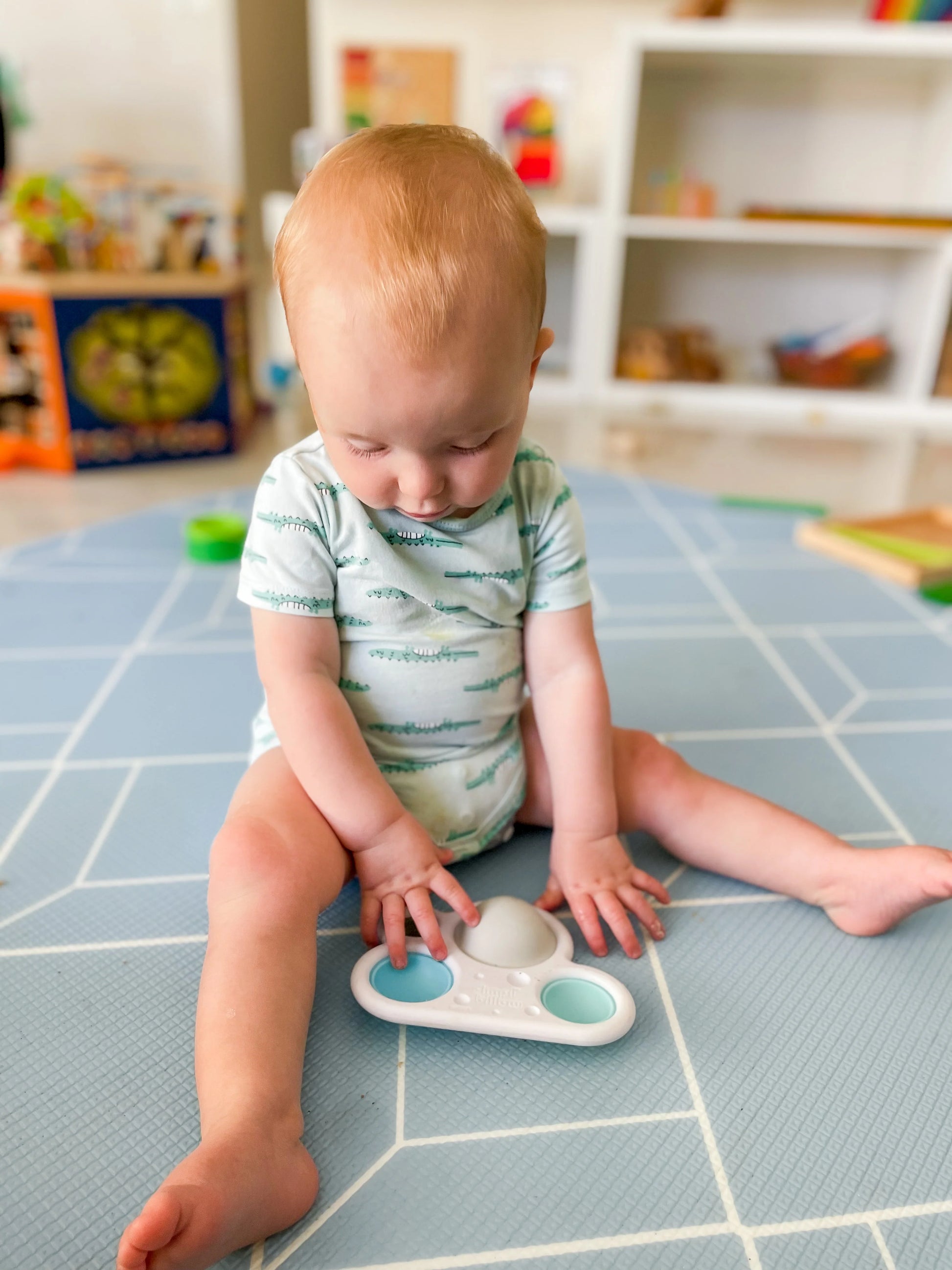 - Encourages sensory exploration, fine motor skills, cause-effect learning
