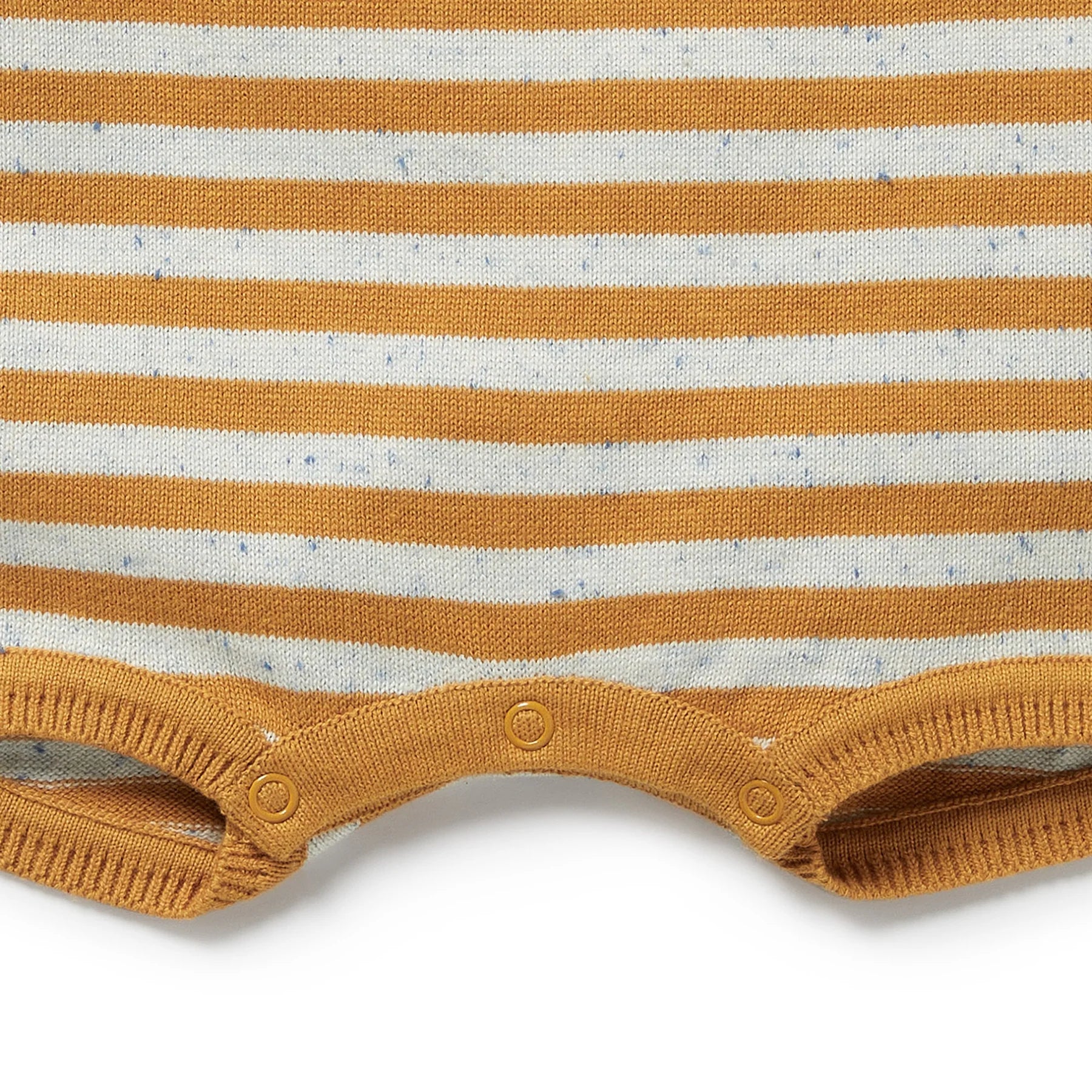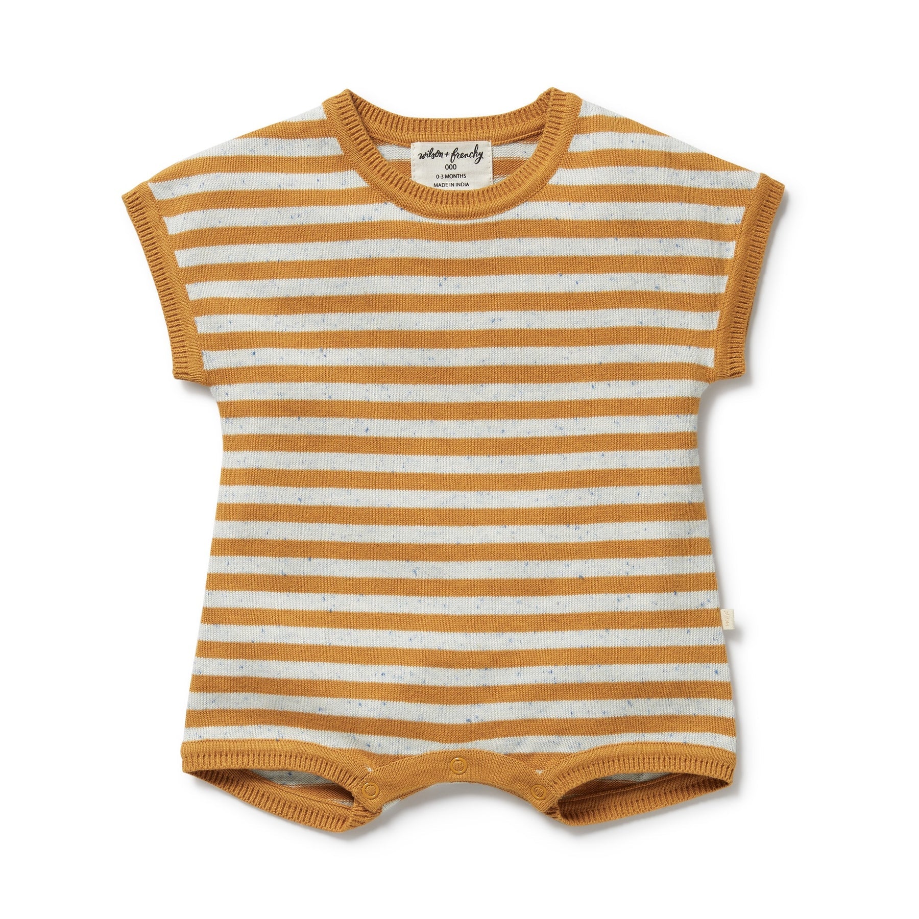 Crafted from soft, breathable organic cotton knit, this cosy one-piece features an all-over golden stripe design that’s perfect for sunny days and playful moments.