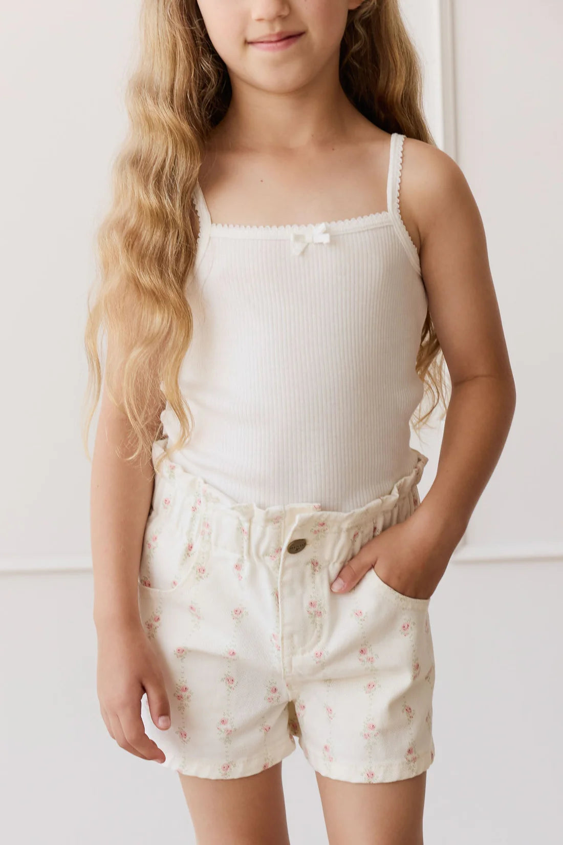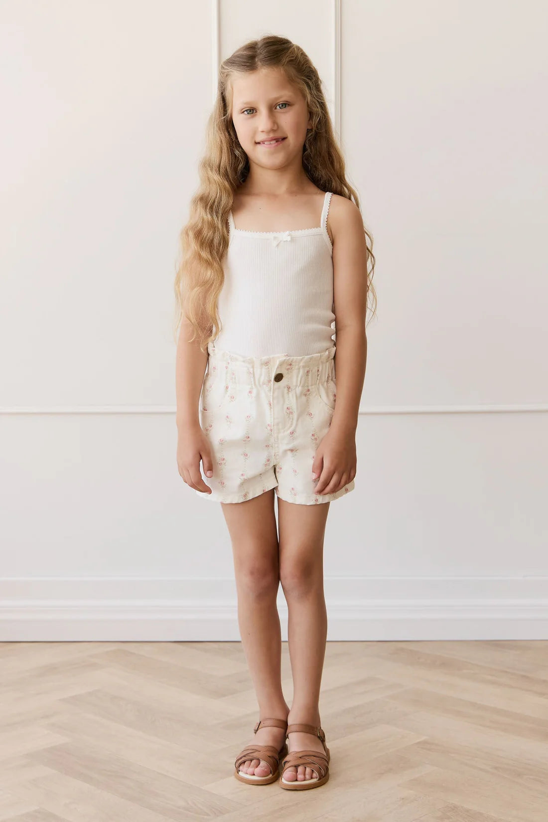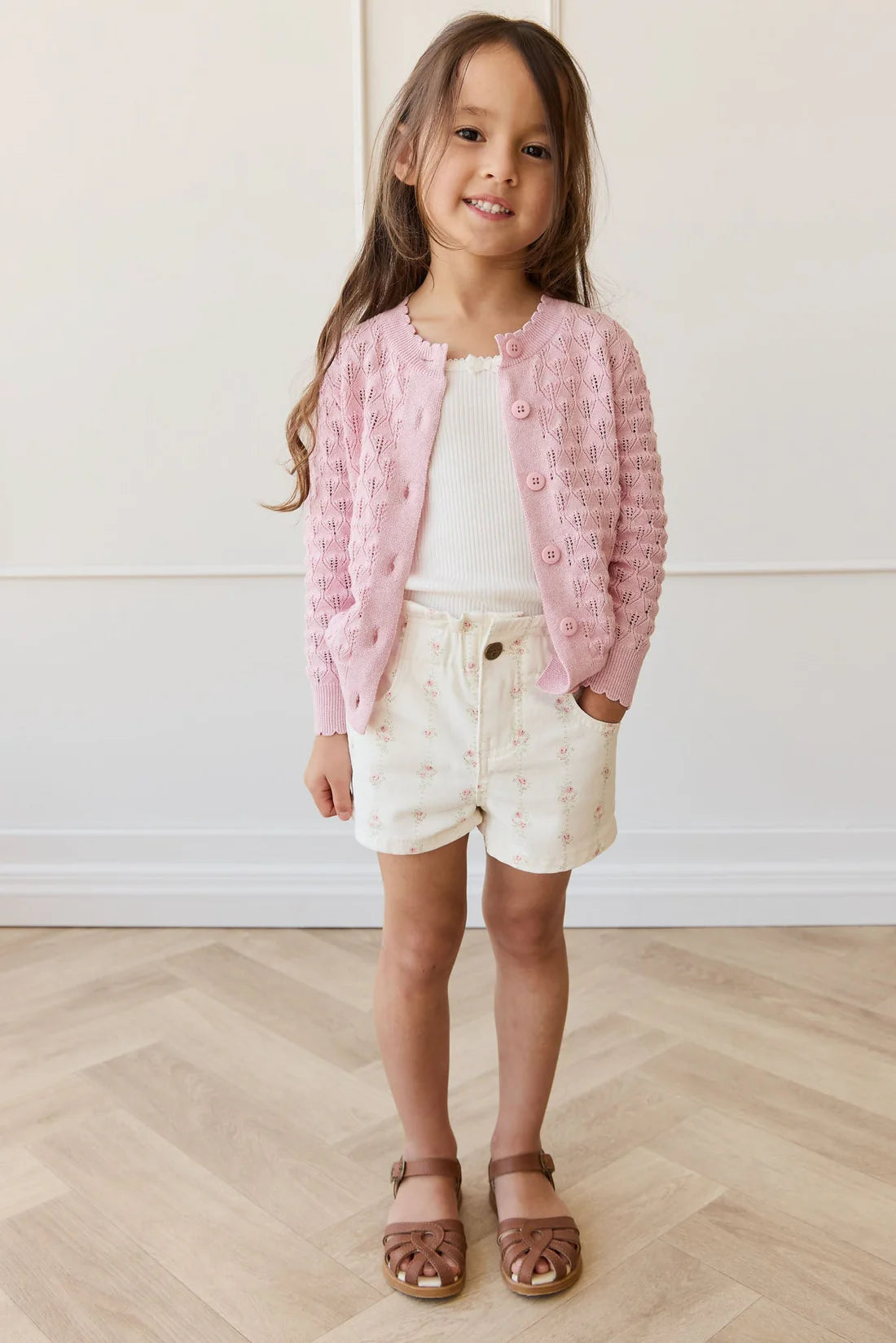 The Kara Short – Rose Trail is a beautifully crafted pair of shorts featuring a delicate vertical floral print in soft pink tones. Designed with an elastic waistband, two front pockets, and nickel-free metal button details, these shorts offer both style and practicality for your little one’s everyday adventures.