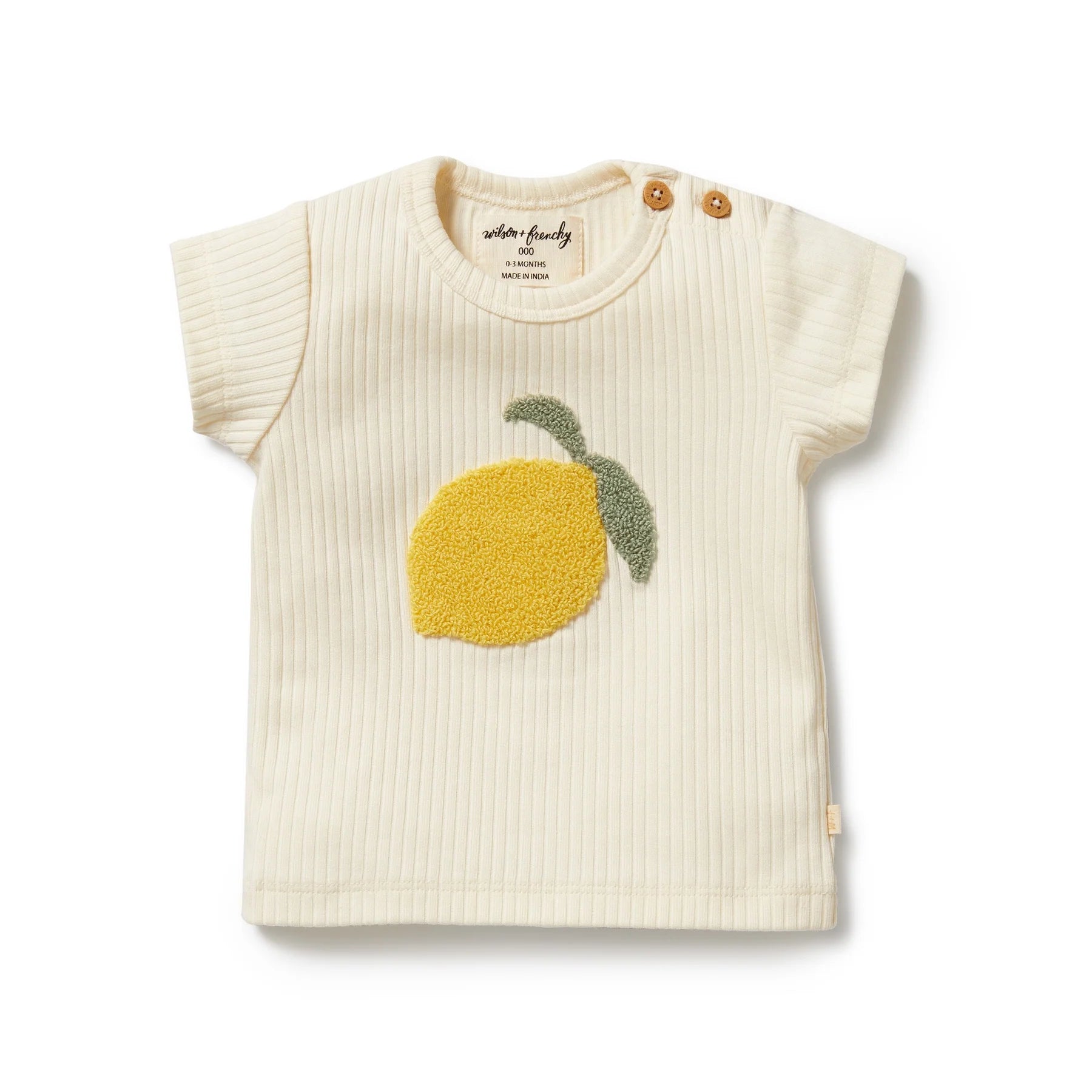 This short-sleeve tee is made from GOTS-certified organic drop needle cotton, offering a soft and breathable feel that's gentle on delicate skin. Featuring a cute lemon embroidery on the chest and a side button opening for easy dressing, it’s a perfect everyday essential with a touch of charm. Light, comfy, and free from harmful chemicals, it’s designed for warm-weather play and all-day wear