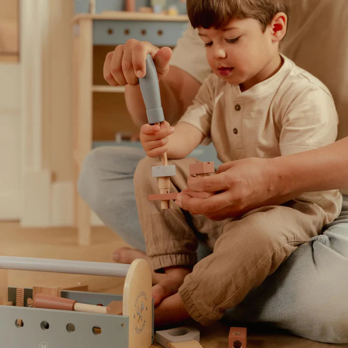 Everything a little carpenter needs! This wooden toolbox includes a hammer, screwdriver, and wrench—perfect for building the most wonderful creations. But that ’s not all – the sides of the box can also be used as a pounding bench! This way, little ones can hammer and screw while playfully developing their motor skills and creativity. Ready to get started?