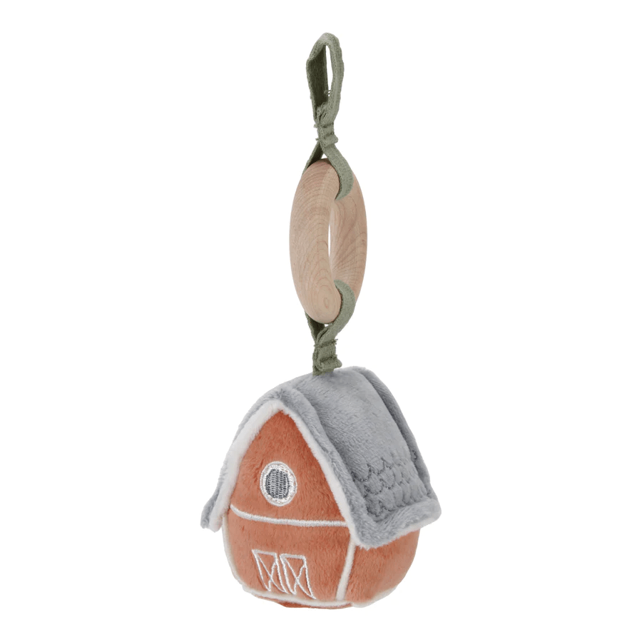 So much to see, feel, and hear. Every day is a new adventure with this playmat from the Little Farm collection. The green mat has two large corduroy arches with 5 different cuddly toys hanging from them. The chicken, cow, sheep, flower, and barn help little ones develop sensory skills and stimulate hand-eye coordination.
