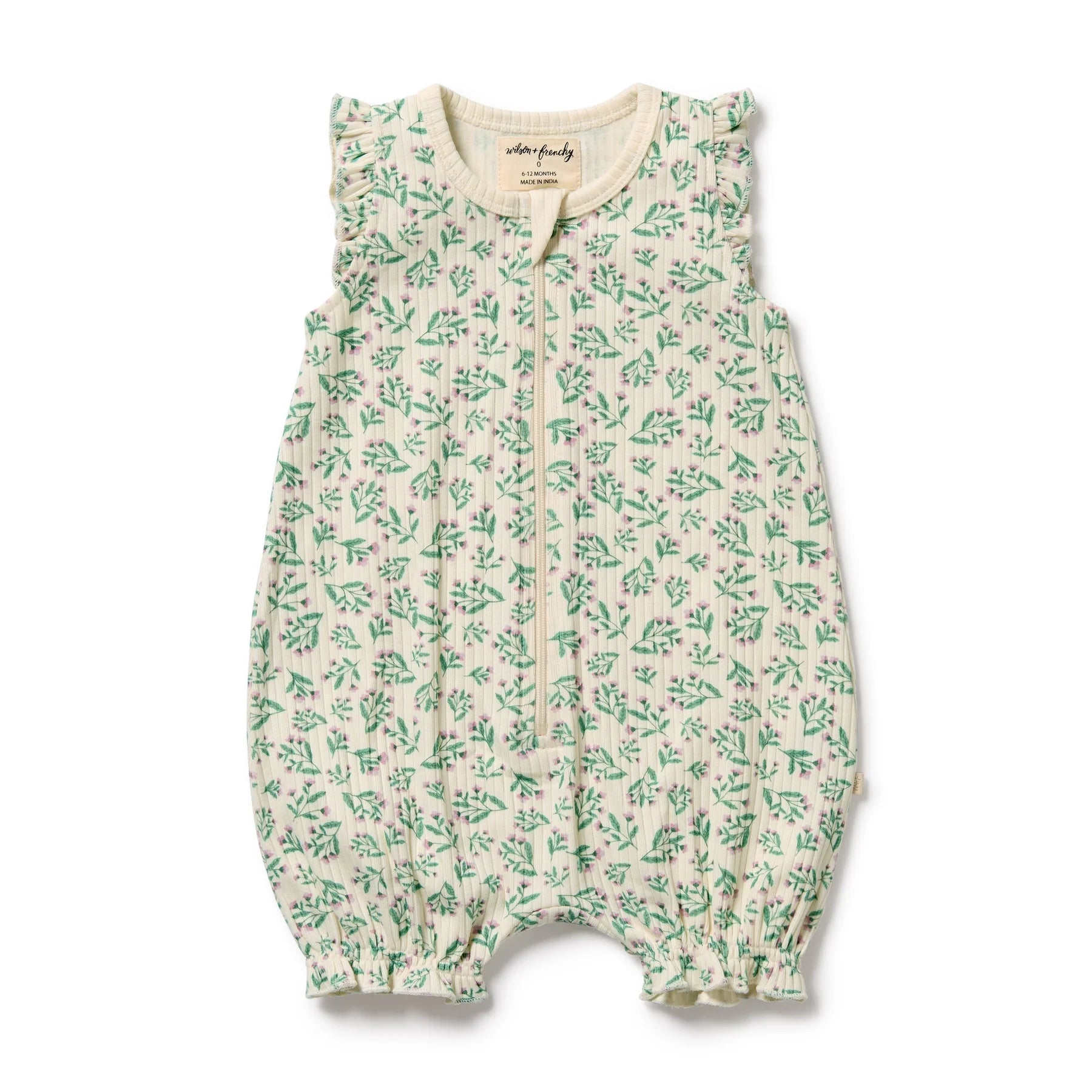 Keep your newborn comfy and cool in this adorable Wilson and Frenchy zipsuit. Made from GOTS-certified organic cotton, it’s gentle on delicate skin and features a hand-illustrated all-over print. Designed with a zip-down front for easy changes, ruffle cap sleeves for a sweet touch, and short legs with shirred openings for a comfy fit that’s perfect for warmer days