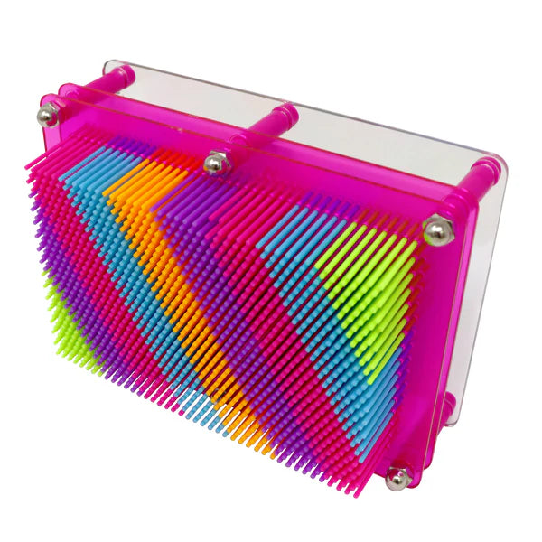 Create your own 3D art in seconds with Pink Poppy's Rainbow Pin Art. Simply push an object or body part into the pin board to create a 3D impression. The 3D impression remains intact as long as you don't disturb it; and when you are ready, you can start all over again by tipping the board back to the horizontal position.