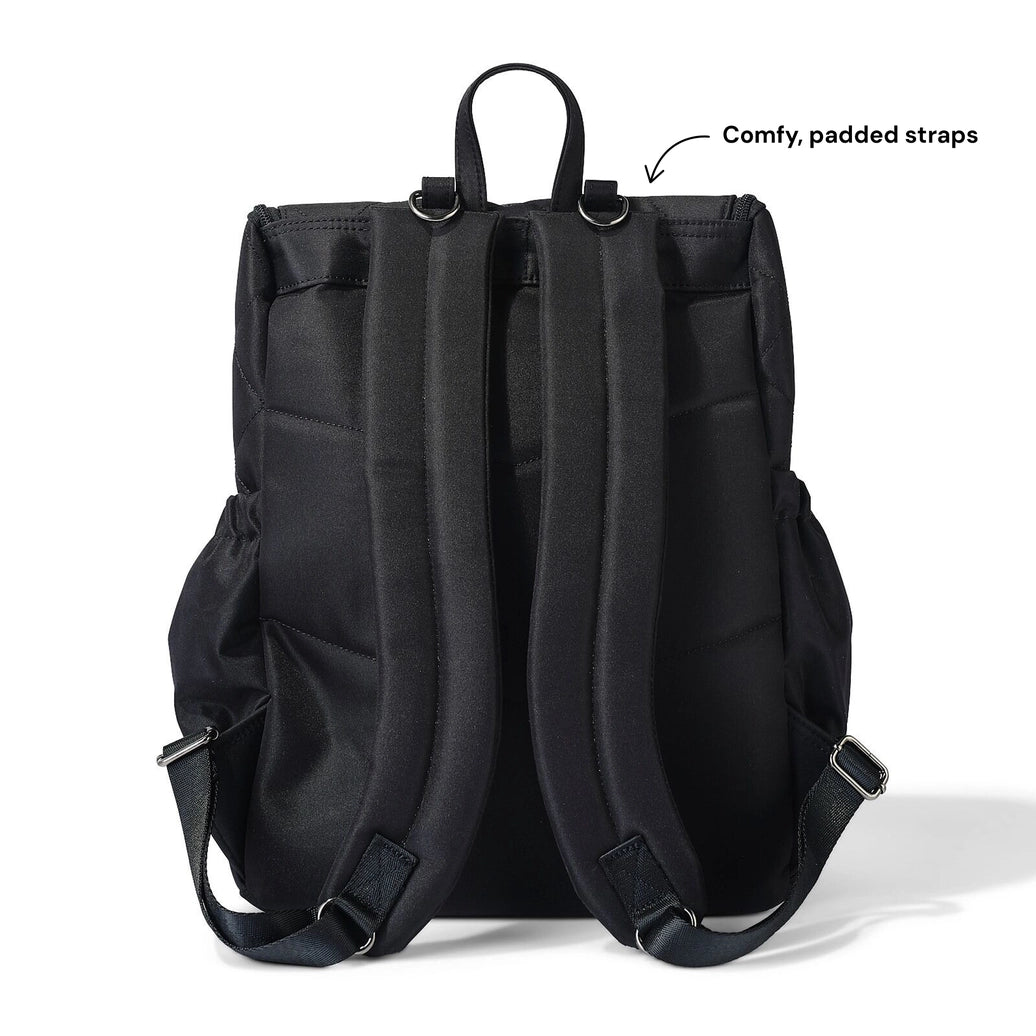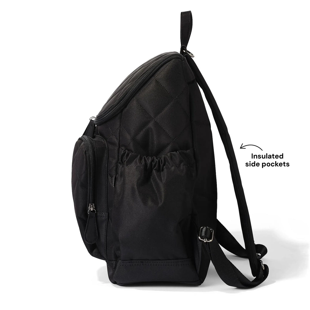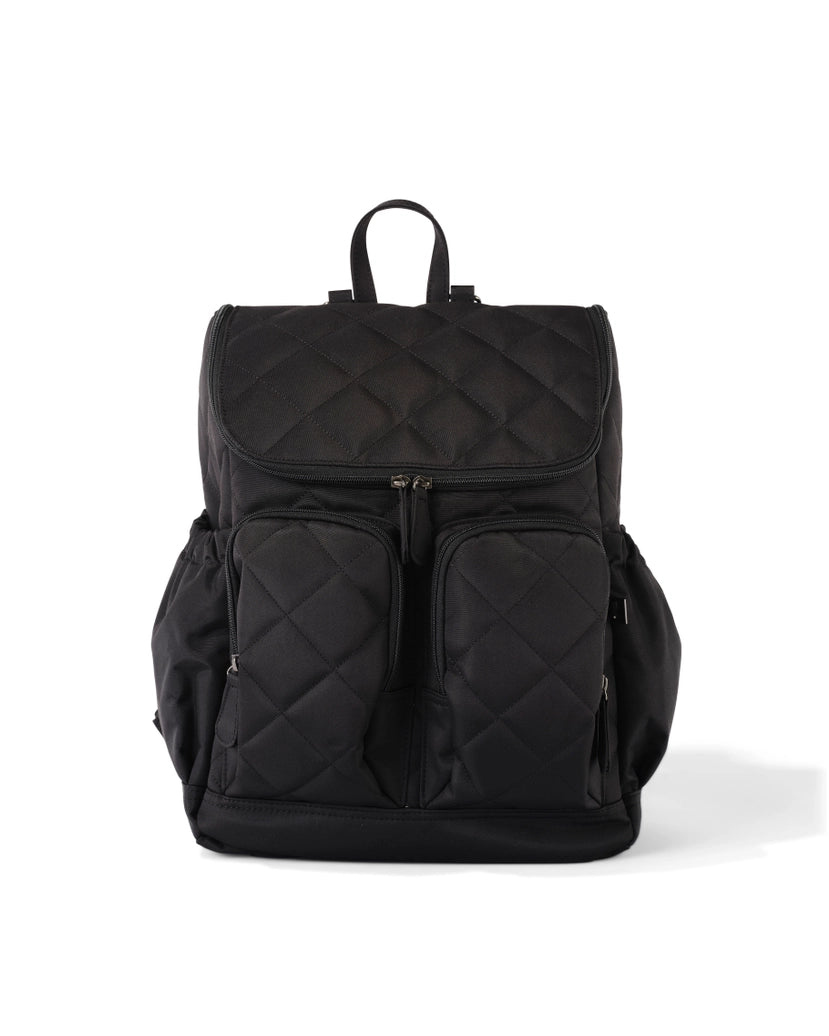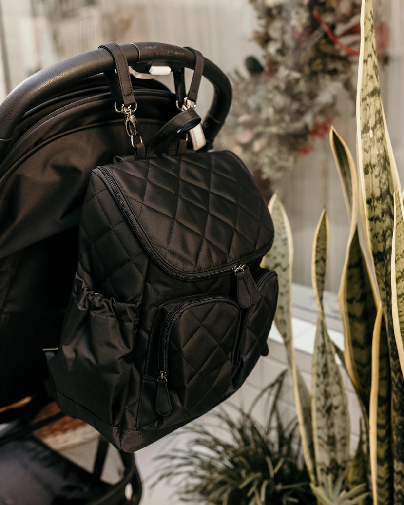 Measures H38cm x W31cm x D15cm Made from Quilted Nylon; Lining: 100% Water-Resistant Nylon Easy to wipe clean inside & out Eight pockets; three internal elasticised pockets, one internal zip pocket, two external front pockets and two external elasticised & insulated pockets for bottles Key clip Protective metal feet at the bottom of the bag Thick, padded, and adjustable shoulder straps Large zip-around opening for easy access to the main compartment 20 litre capacity; fits a 15" laptop in the main compartment Includes large padded wipeable change mat, insulated bottle holder, clear zip purse and two stroller straps.
