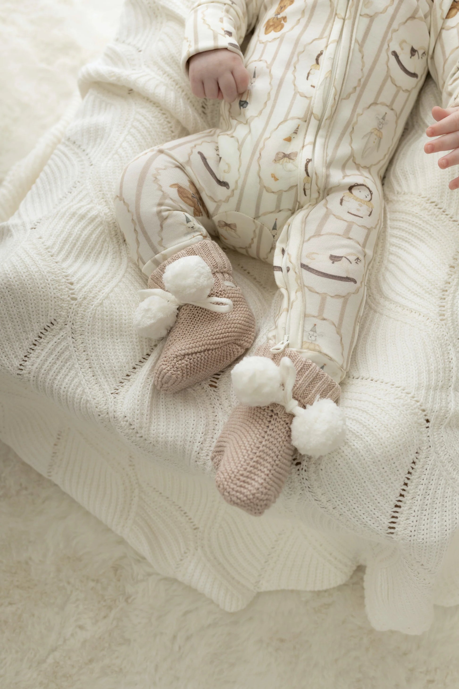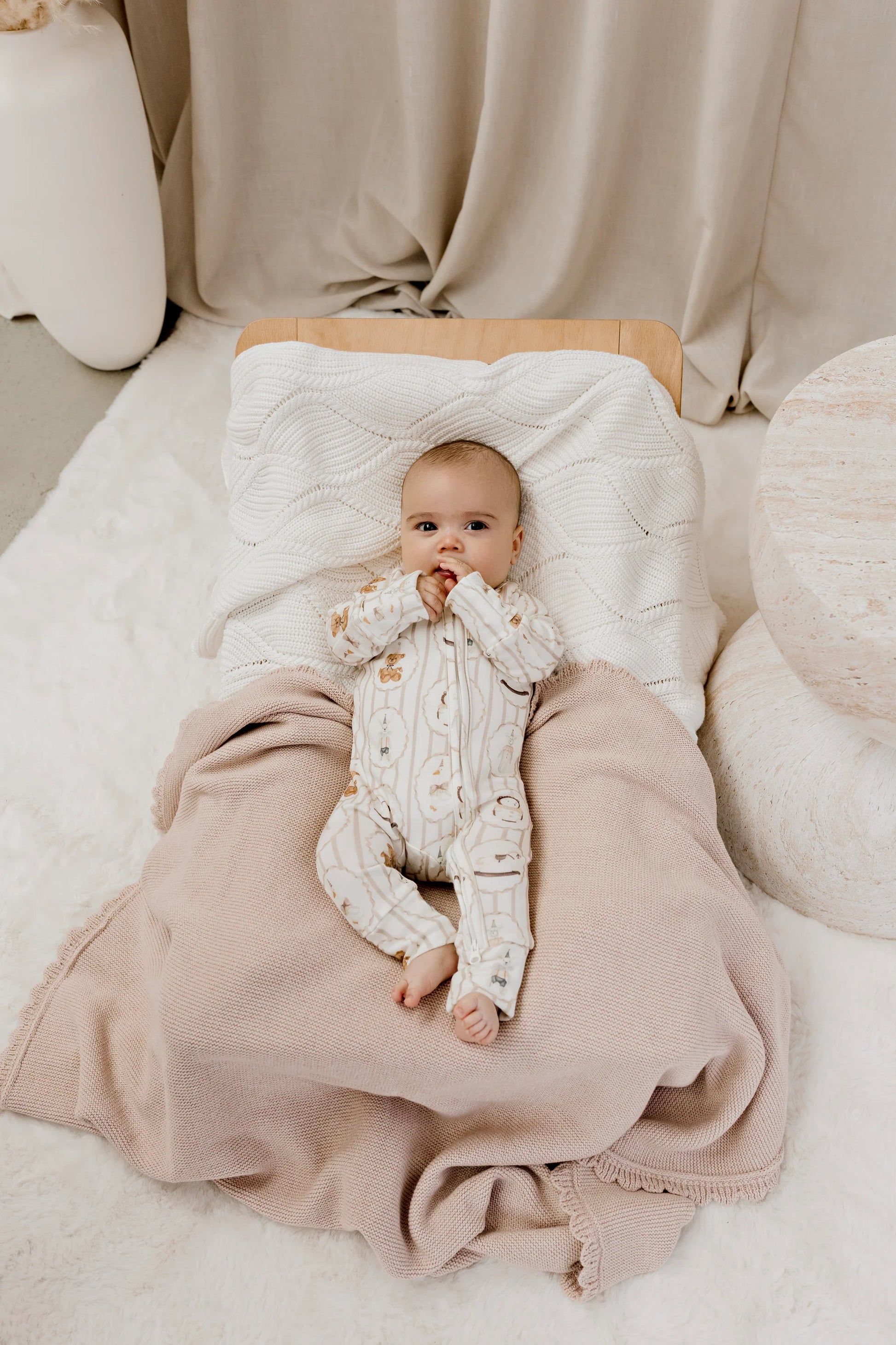 This season’s feature print in our neutral range, Vintage Treasures showcases nostalgic keepsakes in gentle sand and oat tones, finished with a premium YKK double-ended zip for smooth changes.